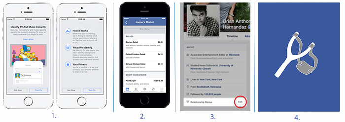 1. Riconoscimento delle canzoni: un po’ come Shazam, Facebook ha lanciato il riconoscimento audio che consente così di realizzare aggiornamenti di status tramite il microfono del proprio smartphone. La funzione può essere sfruttata anche, per esempio, mentre si sta ascoltando una canzone o guardando una serie televisiva: dopo averla riconosciuta, Facebook ne condivide i dettagli con i contatti, senza tuttavia conservarla e permettendo all’utente di regolarne la visibilità. Inoltre, la funzionalità necessita di un’attivazione manuale al fine di non incontrare problemi con la privacy. Lo scopo? Continuare ad incoraggiare l’interazione fra persone con interessi comuni, un po’ come era già successo con l’introduzione della possibilità di includere negli stati  emoticon, sentimenti, attività (iniziativa di successo, con più di 5.000.000 di status update pubblicati in un anno).