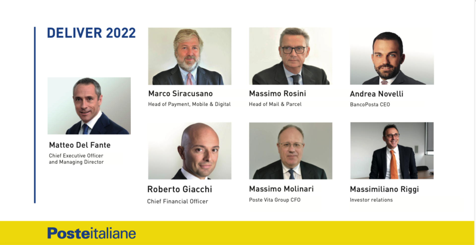 “Deliver 2022 ci consentirà di valorizzare appieno le caratteristiche uniche della nostra rete, e di confermare la nostra posizione di società di distribuzione più sicura ed affidabile d’Italia. Ci stiamo trasformando per rispondere al meglio ai bisogni e ai comportamenti sempre nuovi dei nostri 34 milioni di clienti”, sottolinea Matteo Del Fante, Amministratore Delegato e Direttore Generale di Poste Italiane.