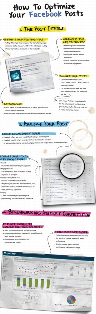Oggi vi proponiamo alcuni suggerimenti per aiutarvi ad ottimizzare i vostri post su Facebook al fine di aumentarne le prestazioni. L’infografica è divisa in tre parti principali: la prima è dedicata interamente al messaggio stesso e al relativo contenuto, la seconda parte riguarda l’analisi degli effetti dei post attraverso Facebook Insights e infine ci si concentra […]